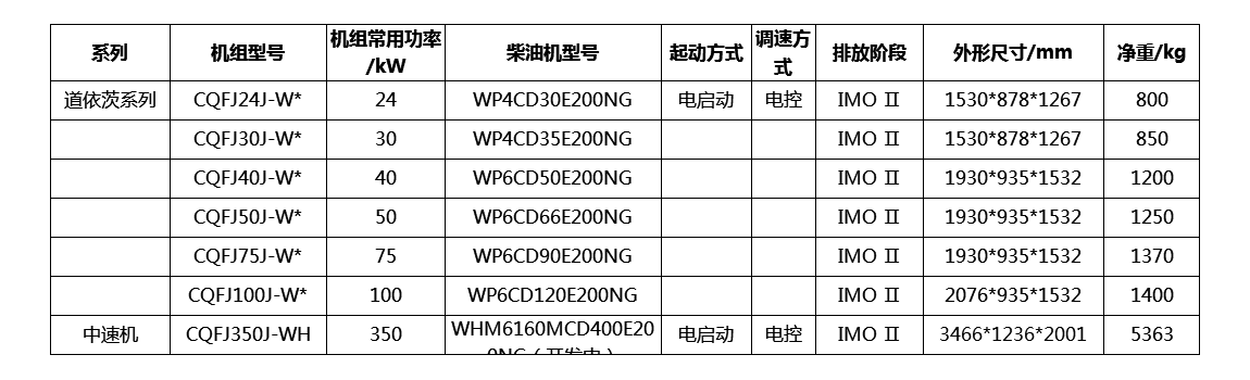 船用燃气机组使用WP4/P6/WP10/WP12/WP13/170/博杜安系列气体机为动力,转速为1500r/min,配套国内知名品牌发电机;功率范围24-500 kW,全面满足国际排放法规,可达到IMO TierⅡ、中国一排放要求,提供CCS船检证书。