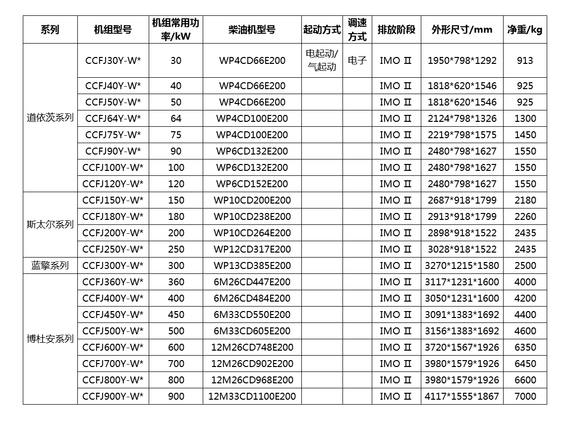 船用应急发电机组使用潍柴生产的道依茨系列、斯太尔系列及博杜安系列柴油机为原动机,配套知名品牌发电机,功率范围30-800 kW。转速为1500r/min或1800r/min,可提供CCS船检证书、ZY船检证书、法国BV船检证书、俄罗斯RS船检证书、和美国ABS船检证书等。
