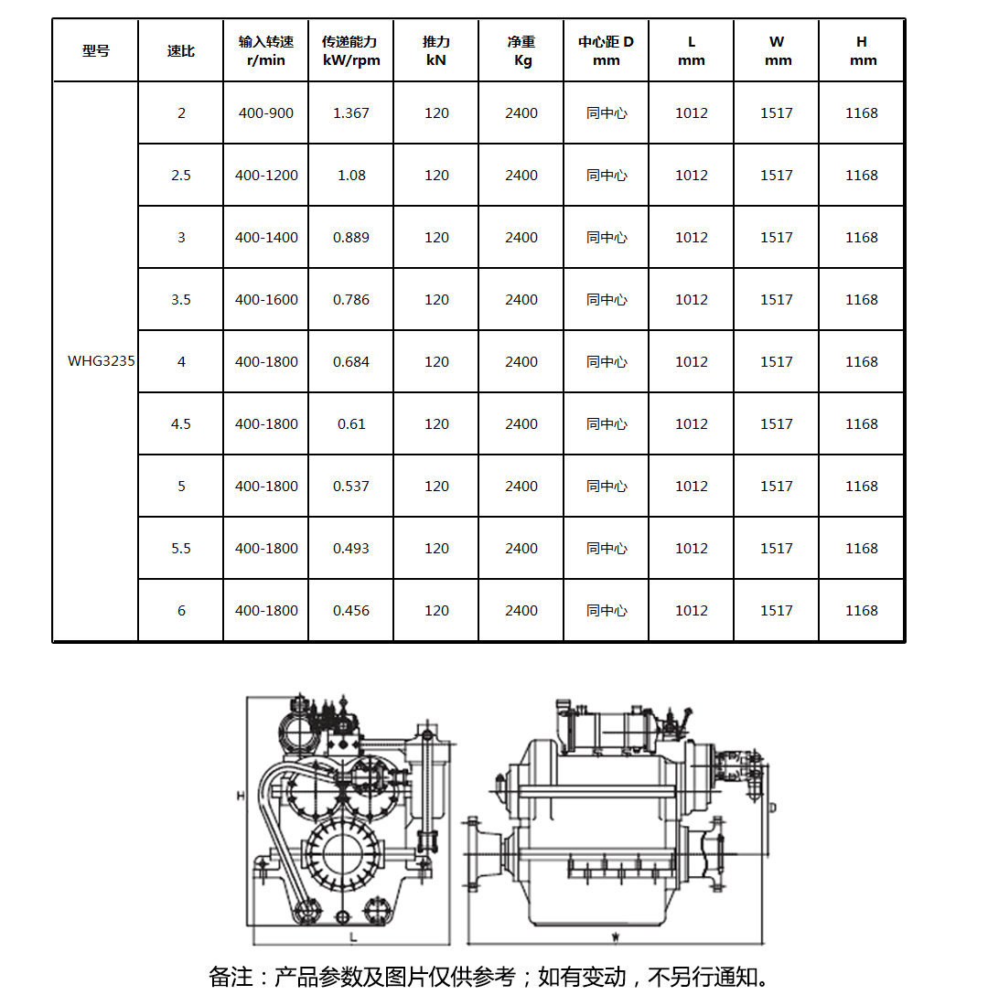 • WHG大功率系列船用齿轮箱具有减速、倒顺、离合和承受螺旋桨推力的功能。其结构紧凑、可靠性好。输入联轴节可以根据用户所选的高弹联轴节定制,功率范围182-3202 kW传递能力在0.456~5.189之间,能够满足各种速比要求。输入轴与输出轴同中心,由于倒顺车减速比完全相同,并且都能全负荷工作,所以可与CW6200、CW8200、CW250等中速柴油机配套,组成左右机组。
